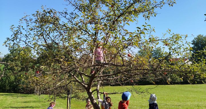 Wir singen Herbstlieder, lernen den Zauberatem kennen und klettern auf die Bäume, um uns frische Äpfel zu pflücken.