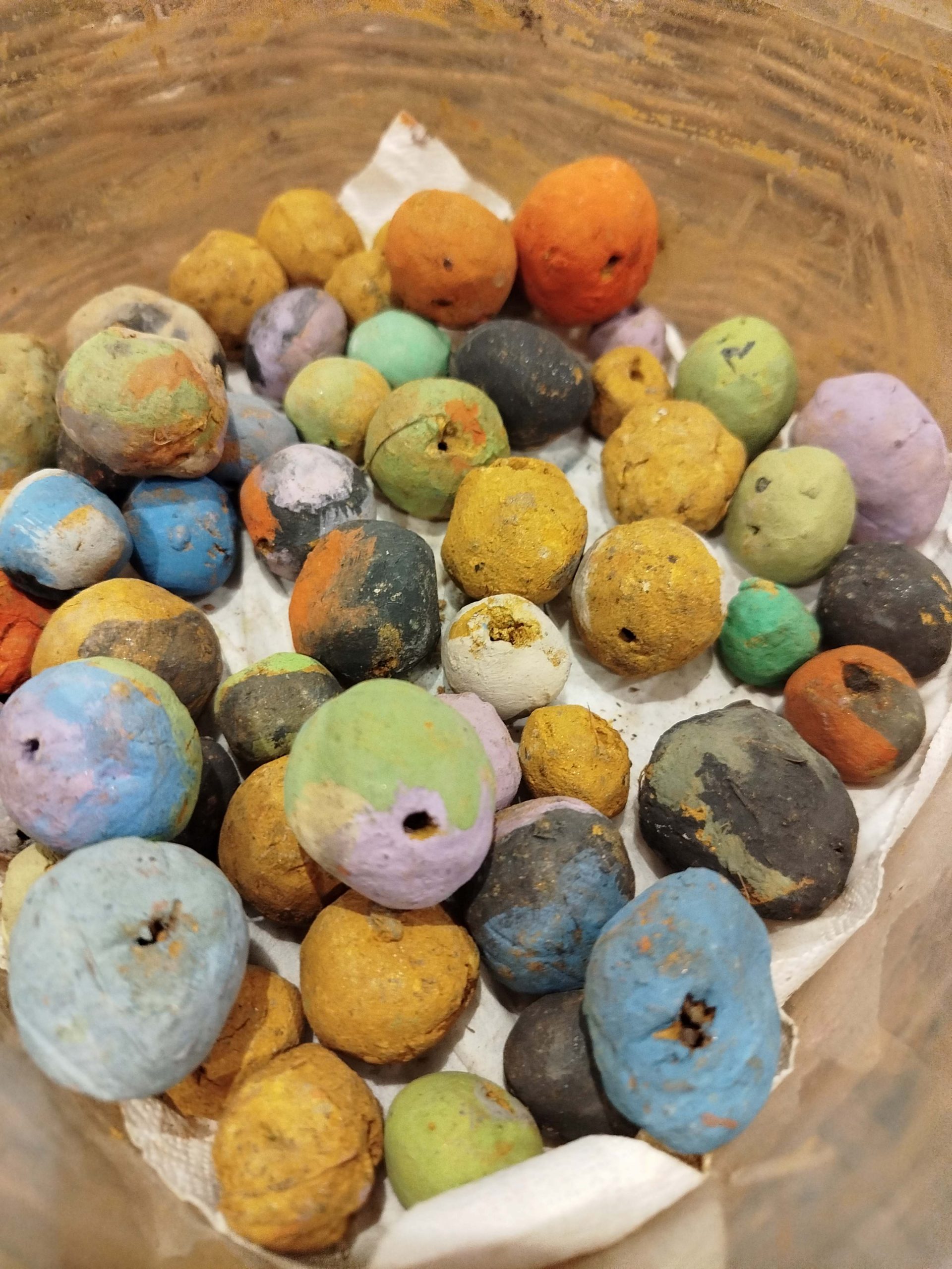 … bei uns im Wald finden wir auch lehmigen Boden – was man daraus machen kann? Ja, verschiedene Figuren, die wir zum Spielen verwenden können aber auch Kugeln, so wie auf diesem Bild. Getrocknet oder am Feuer gebrannt kann man sie zu richtigen Waldlehmperlen gestalten. Was daraus wohl noch entstehen wird? Das Formen, Kneten, Schaufeln und Matschen ist ein wichtiger Beitrag zur Entwicklung der Grob- und auch Feinmotorik. Unsere Kinder machen hier verschiedene Sinneserfahrungen und